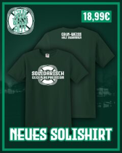 Zur Unterstützung unserer Arbeit haben wir ein neues Solishirt aufgelegt. Erhältlich ist das T-Shirt ab kommenden Samstag gegen den HSV. Unseren Infostand findet ihr gegenüber vom OstKurvenSaal. Die Shirts gibt es in den Größen S – 3XL, solange der Vorrat reicht.